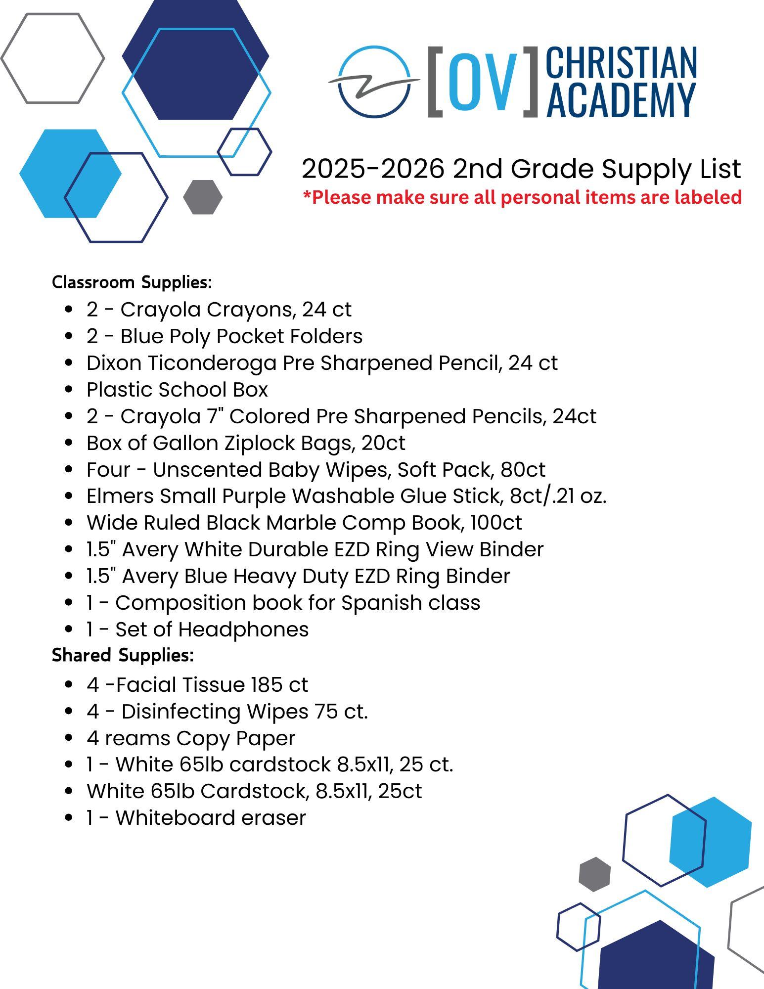 2025 -2026 2nd Grade Supply List