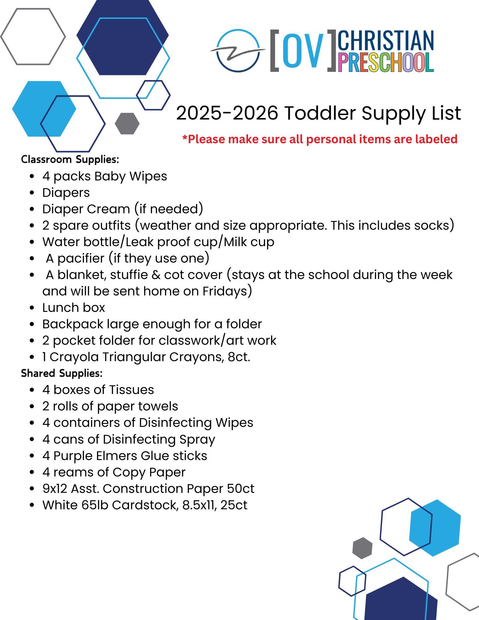 2025 - 2026 Toddler Supply List