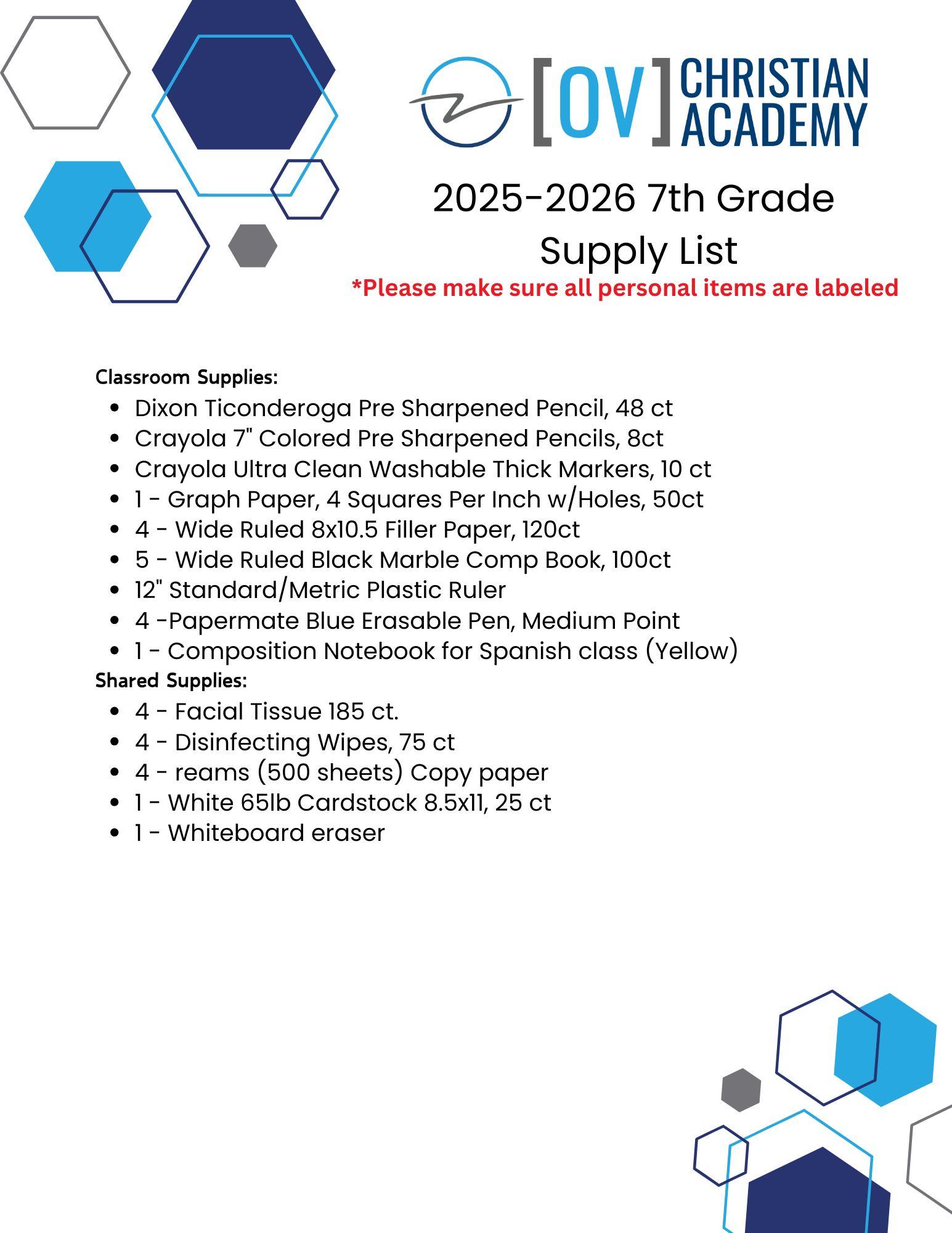 2025 - 2026 7th Grade Supply List