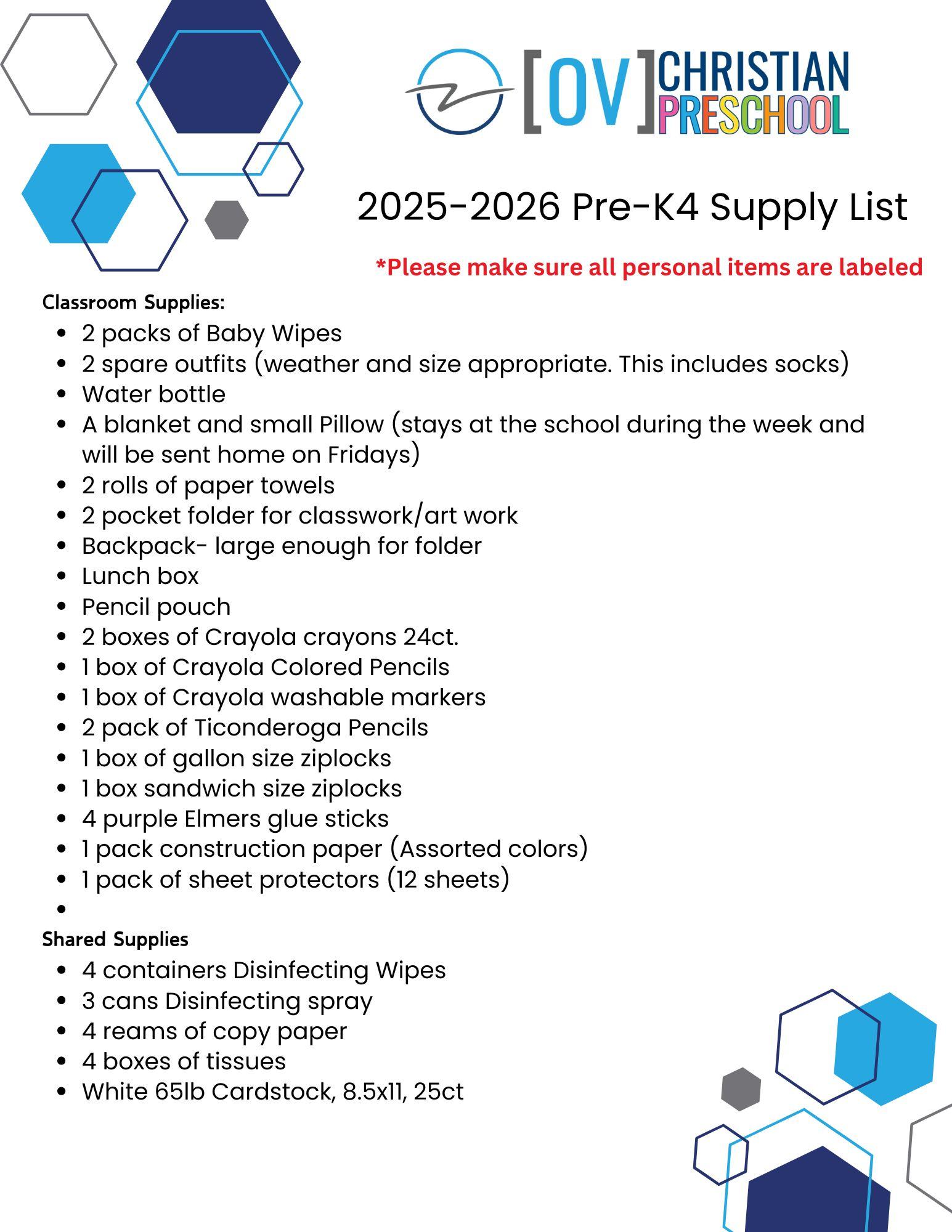 2025 - 2026 Pre-K4 Supply List