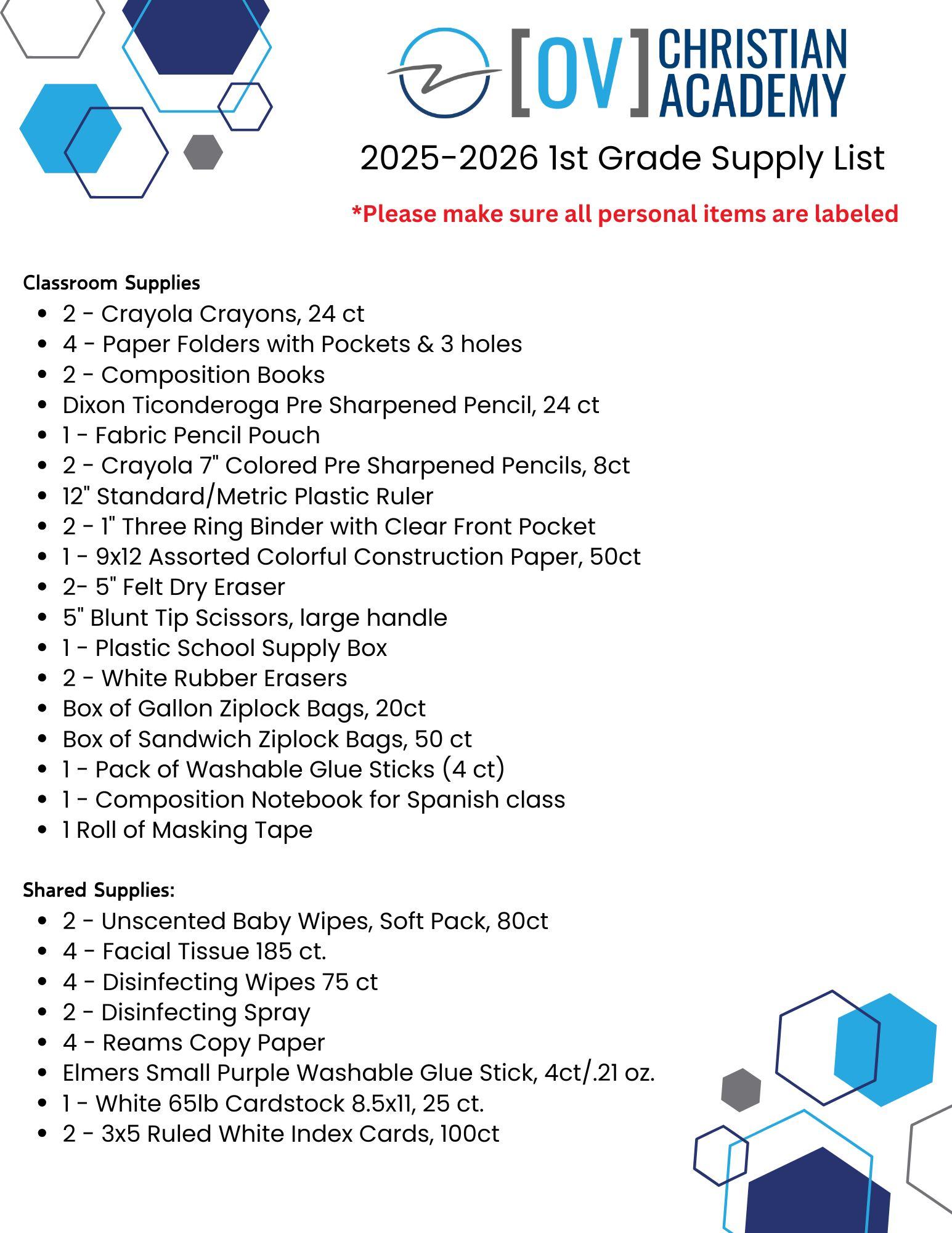 2025 -2026 1st Grade Supply List