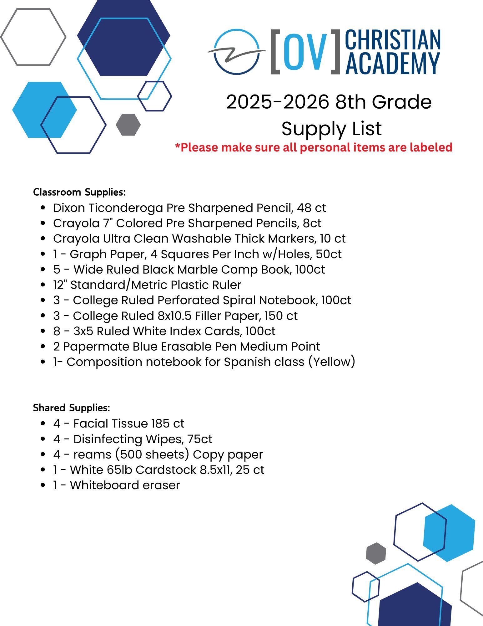 2025 - 2026 8th Grade Supply List