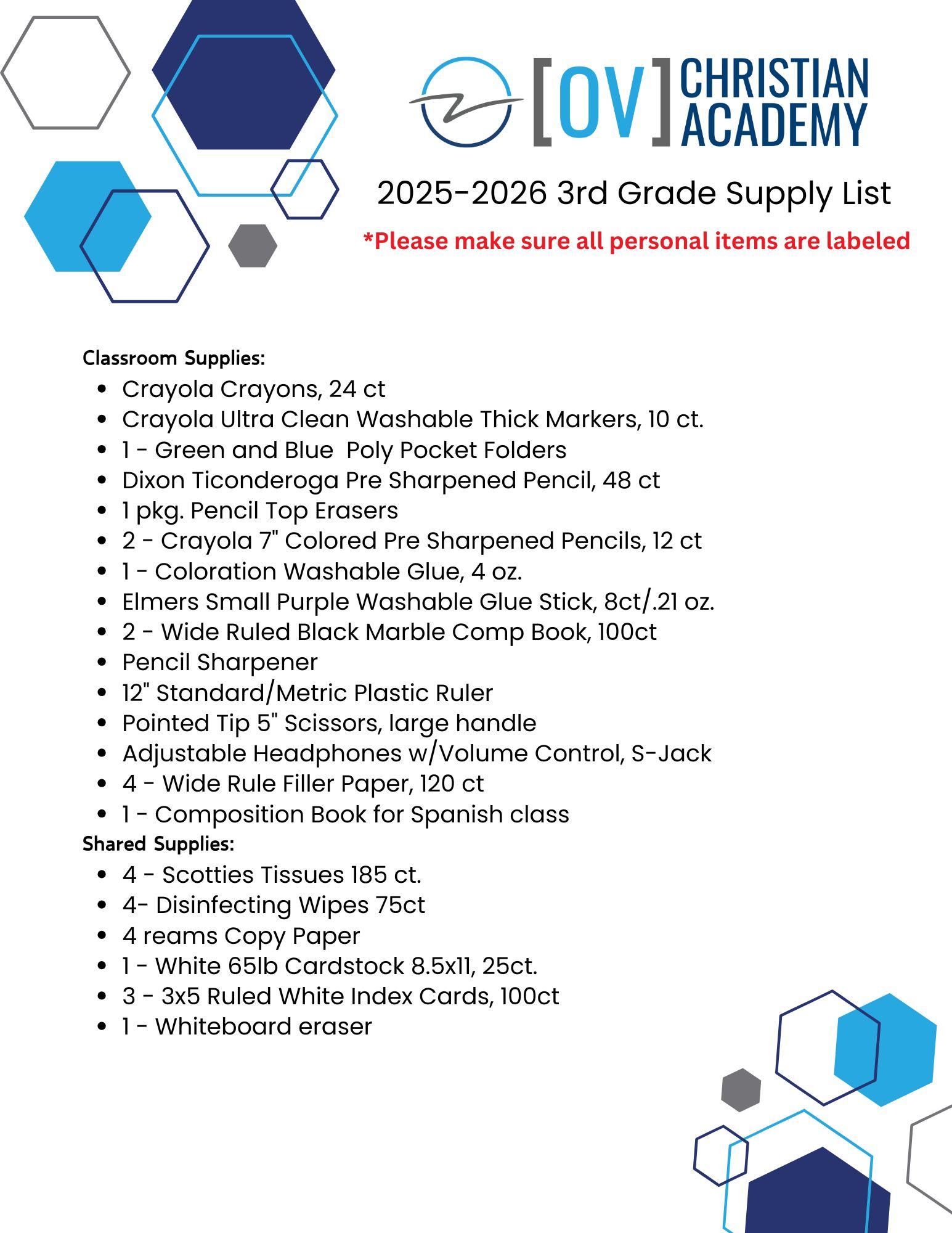 2025 - 2026 3rd Grade Supply List