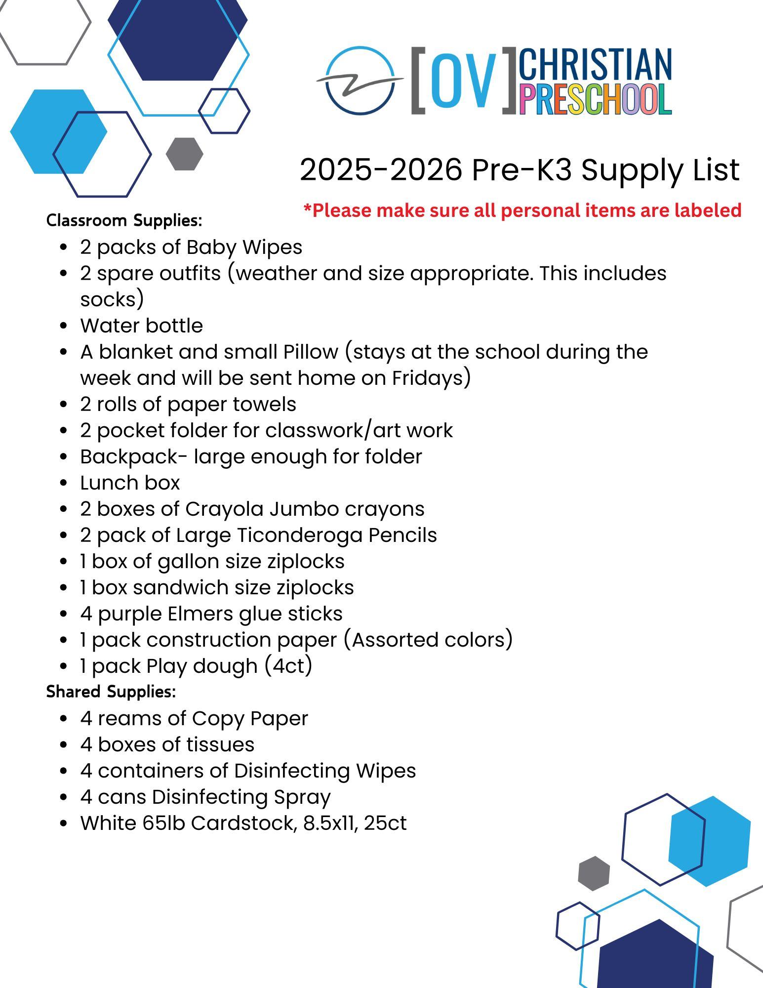 2025 - 2026 Pre-K3 Supply List