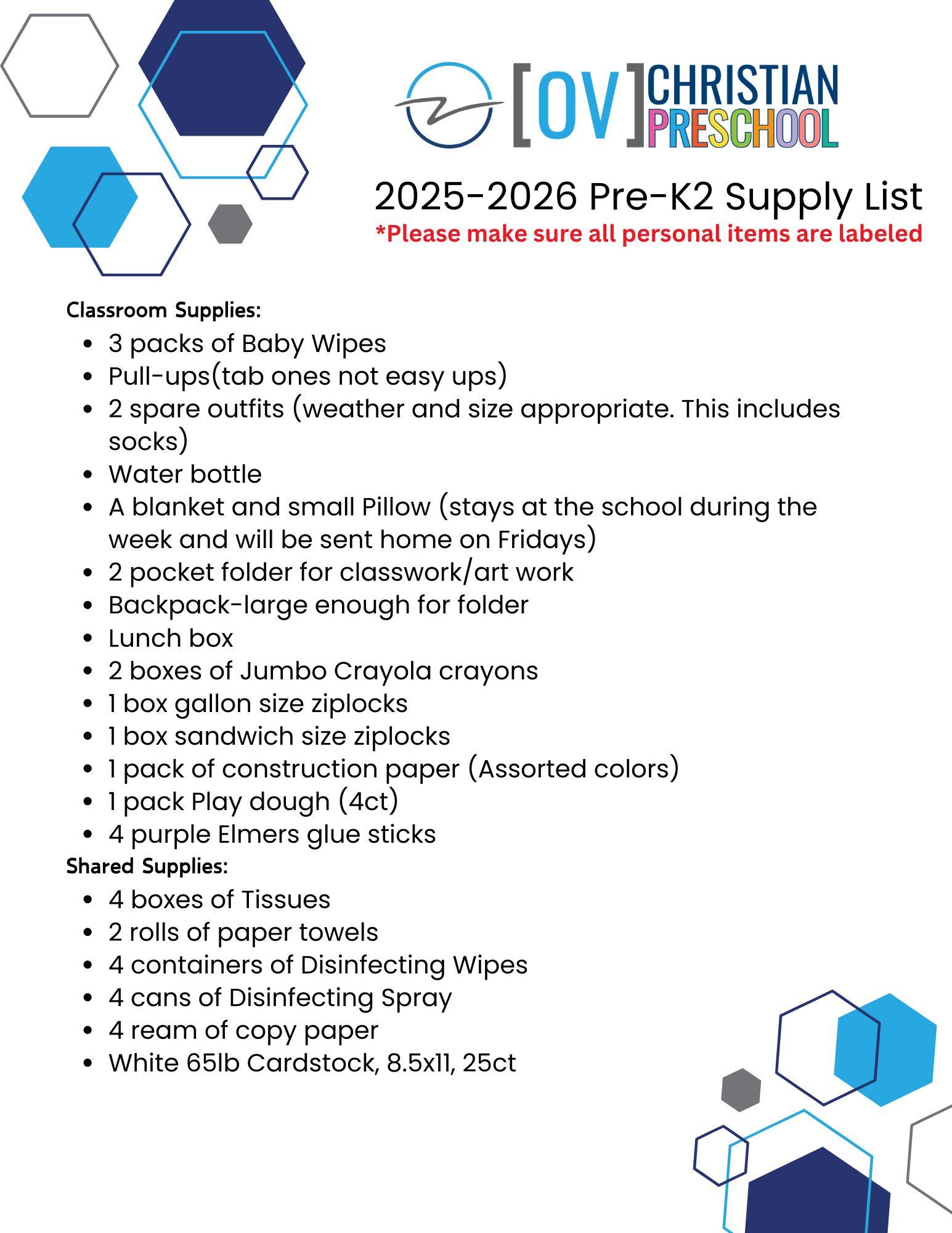 2025 - 2026 Pre-K2 Supply List