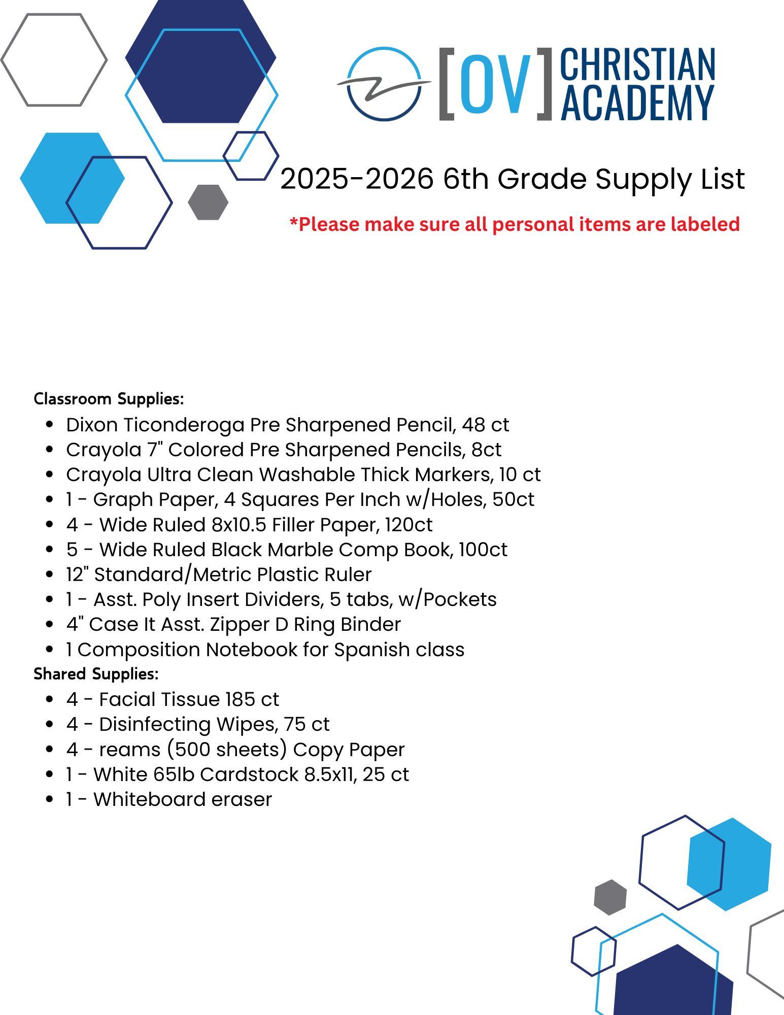 2025 - 2026 6th Grade Supply List