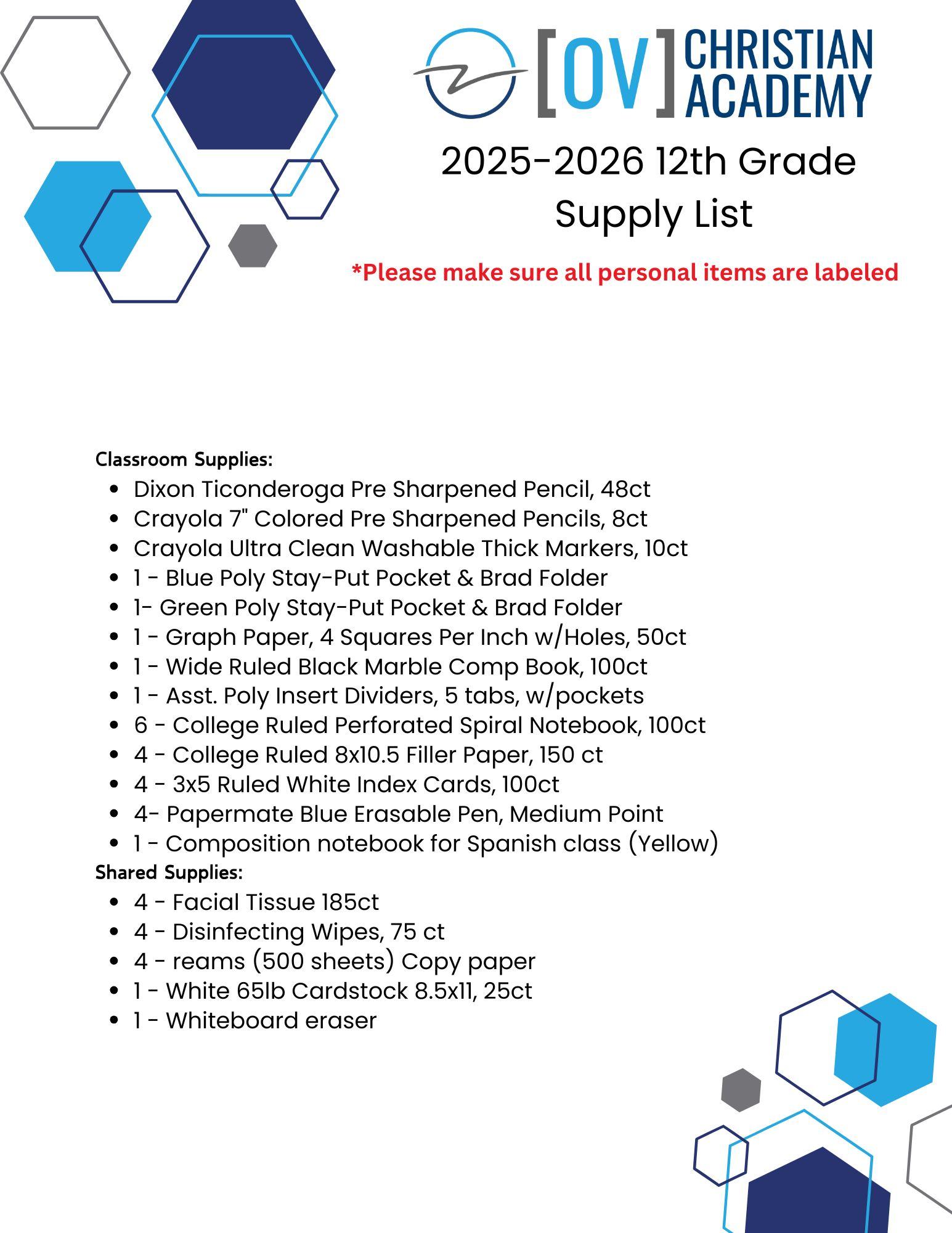 12th Grade Supply List
