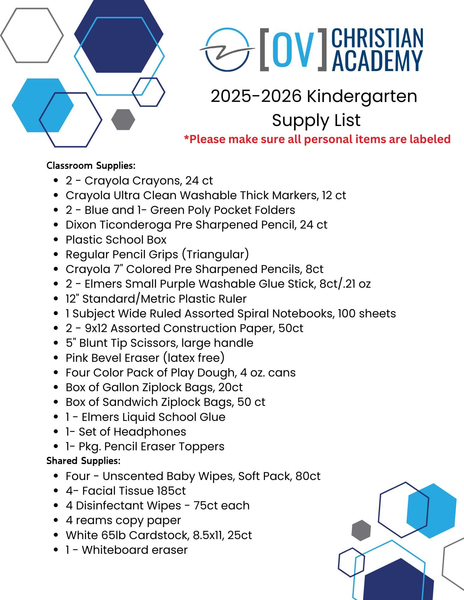 2025 - 2026 Kindergarten Supply List
