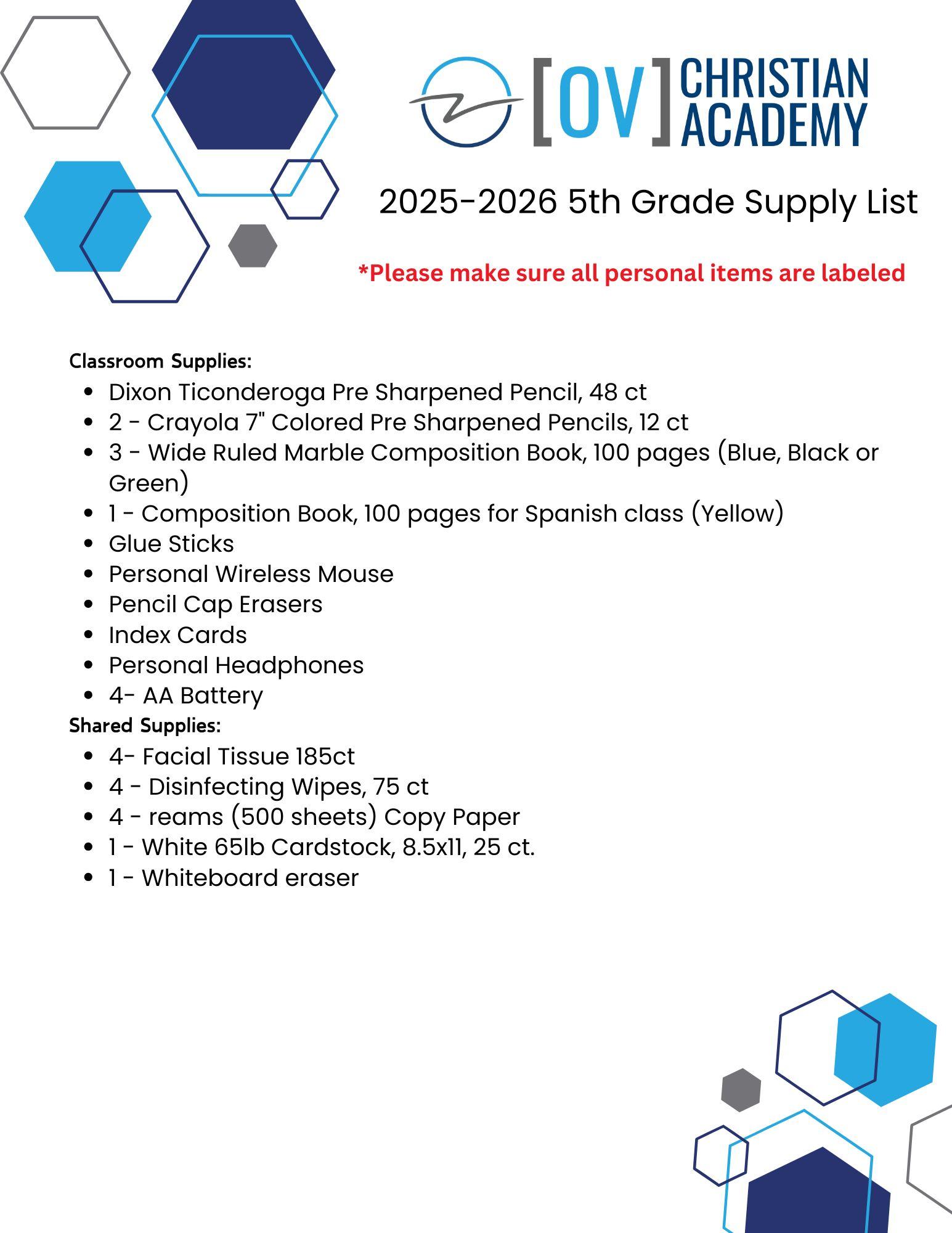 2025 - 2026 5th Grade Supply List